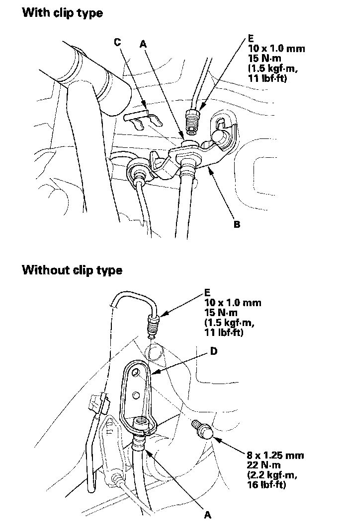 ^ Without clip type: Install the brake hose bracket (D) to the frame.