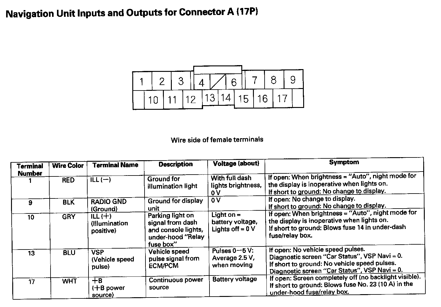 Navigation Unit Inputs And Outputs For Connector A (17P):