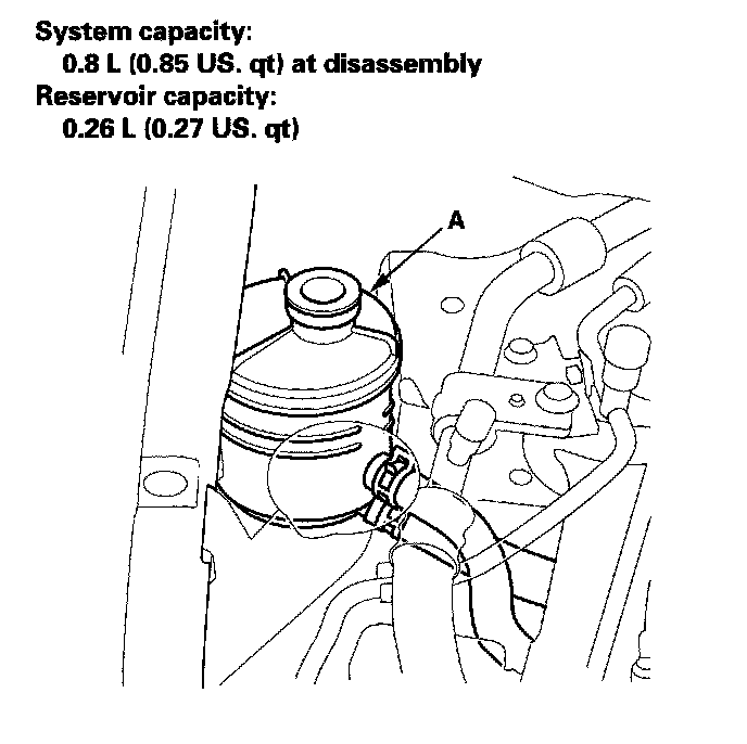 Fluid ReplacementCheck the reservoir (A) at regular intervals, and add the recommended fluid as necessary. Always use Honda Power Steering Fluid. Use of any other type of power steering fluid or automatic transmission fluid can cause increased wear and poor steering in cold weather.