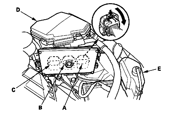 4. Remove the coolant reservoir (E). Disconnect the ECM/PCM connectors A, B, and C, and probe the terminals from the terminal side of the connectors.
