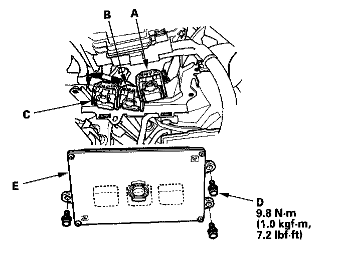 10. Remove the bolts (D), then remove the ECM/PCM (E).