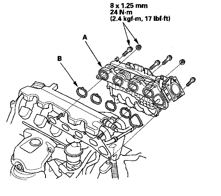 (A) with new gaskets (B), and tighten the bolts and nuts in a crisscross pattern in two or three steps, beginning with the inner bolt.