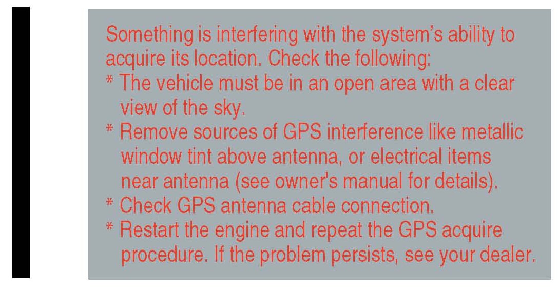 ^ The GPS antenna receives location information from orbiting satellites. Anything that blocks or interferes with the signal will affect accuracy. The GPS signal can be blocked or interfered with (vehicle position shown incorrectly on the map) by: