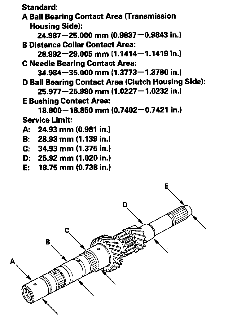 Mainshaft Inspection1. Inspect the gear and bearing contact areas for wear and damage, then measure the mainshaft at points A, B, C, D, and E. If any part of the mainshaft is less than the service limit, replace it.