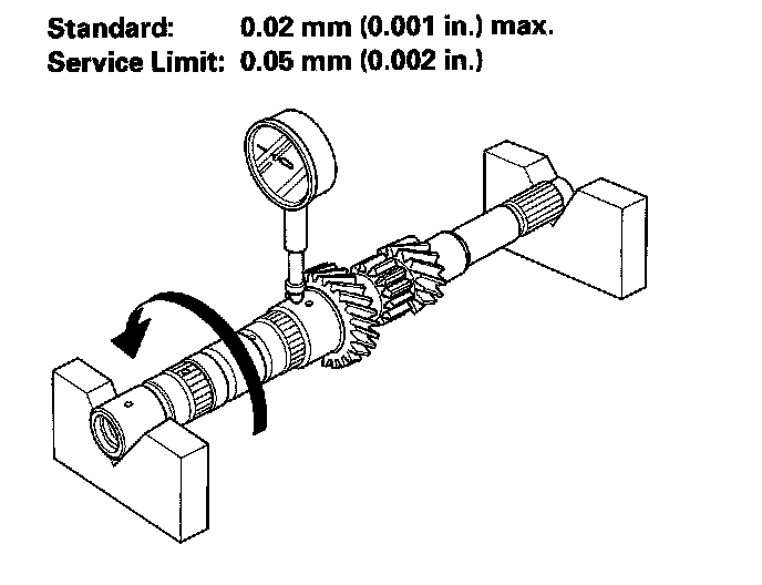 2. Inspect the runout by supporting both ends of the mainshaft. Rotate the mainshaft two complete turns while measuring with a dial gauge. If the runout is more than the service limit, replace the mainshaft.