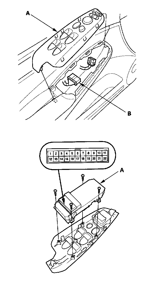 2. Disconnect the 22P connector (B) from the power window master switch.