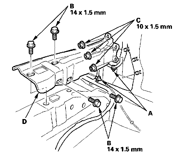 5. Remove the bolts (B) and nuts (C), then remove the middle cross-member gusset (D).