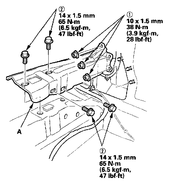 6. Install the gusset in the reverse order of removal. When installing the mounting bolts for the middle cross-member gusset (A), torque the mounting hardware in the sequence shown. If the mounting bolts are not torqued in this sequence, damage to the quarter panel will occur.