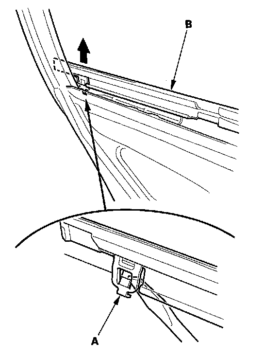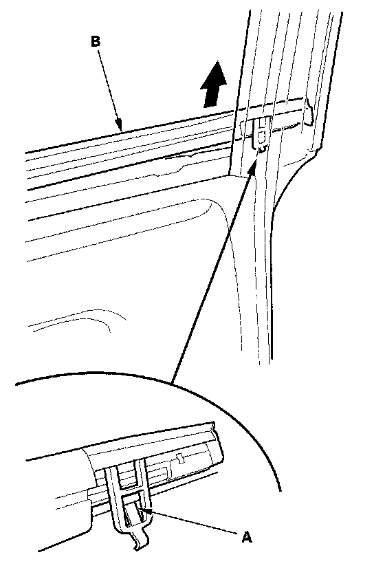 2. Release the front hook (A) from inside of the door, then pull up the front portion of the rear door glass outer weatherstrip (B).