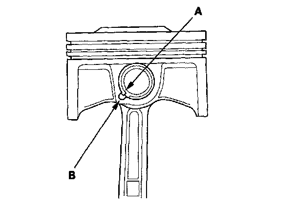 2. Apply new engine oil to the piston pin snap rings (A), and turn them in the ring grooves until the end gaps are lined up with the cutouts in the piston pin bores (B).