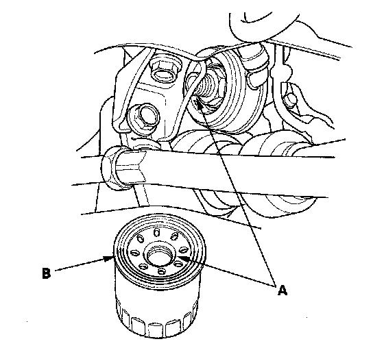 3. Inspect the threads (A) and rubber seal (B) on the new filter. Clean the seat on the oil cooler, then apply a light coat of new engine oil to the filter rubber seal. Use only filters with a built-in bypass system.