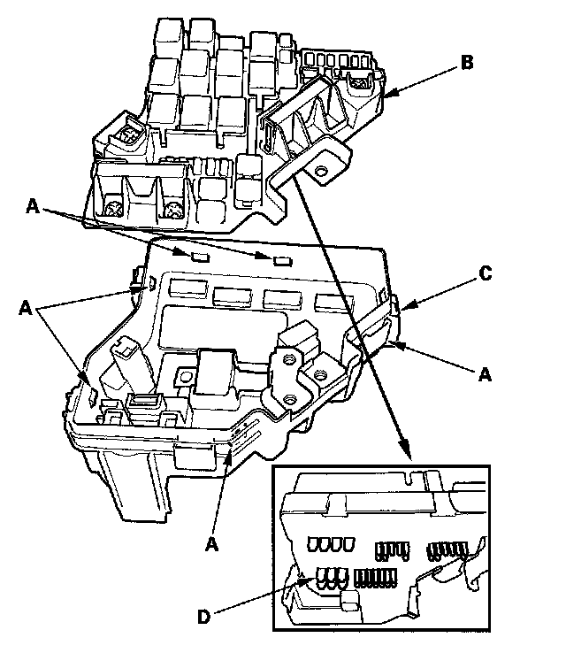 5. Turn the housing over again. Using two flat-tip screwdrivers, release the tabs (A), and pry up the fuse/relay box base (B) from the fuse/relay box housing (C).