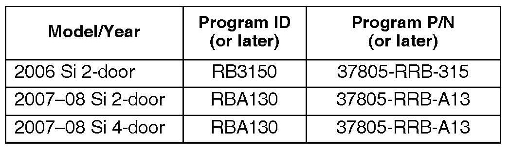 The updated PGM-FI software program ID and P/N are shown below. If this, or later program ID is the Current Program ID displayed during the update, the software for this service bulletin is already installed.