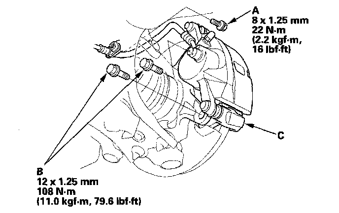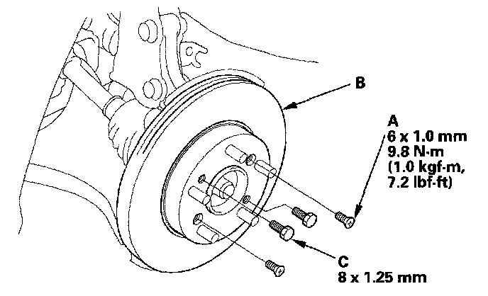 NOTE: If the brake disc has clung to the hub. Screw two 8 x 1.25 mm bolts (C) into the brake disc to push it away from the hub. Turn each bolt 90° to prevent the brake disc from binding.
