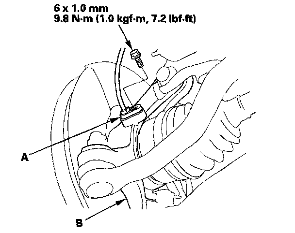 5. Remove the wheel sensor (A) from the knuckle (B). Do not disconnect the wheel sensor connector.