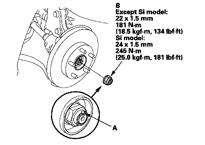 ^ Before installing the spindle nut, apply a small amount of engine oil to the seating surface of the nut. After tightening, use a drift to stake the spindle nut shoulder against the driveshaft.