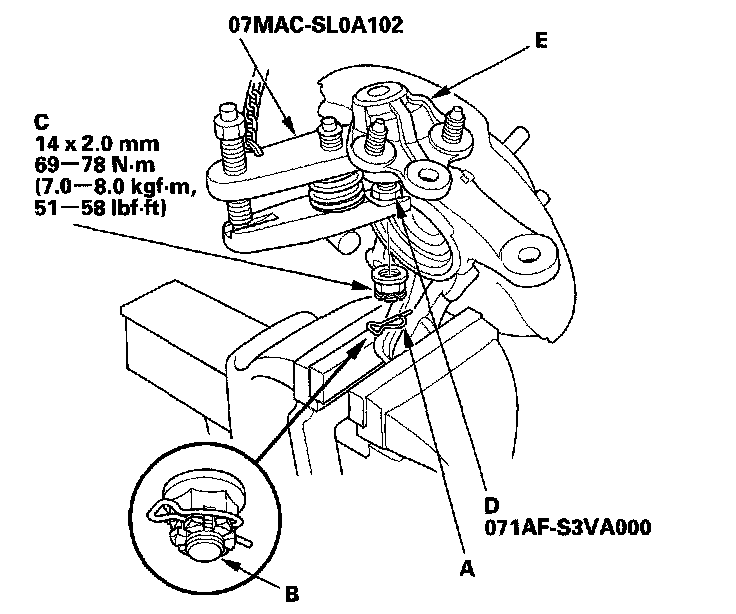13. Disconnect the lower ball joint (E) from the lower arm.