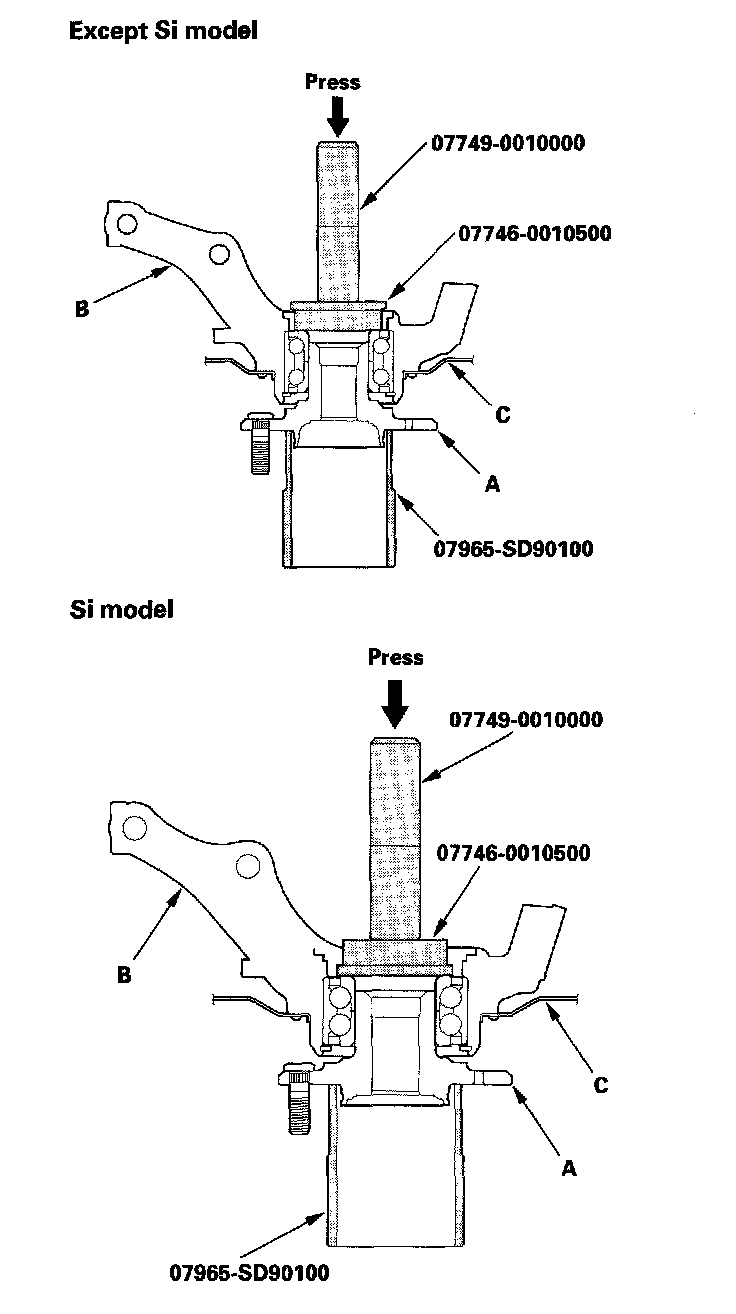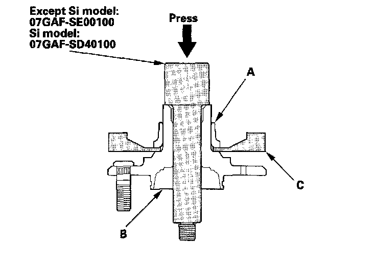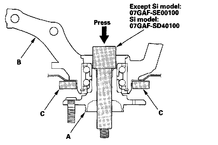 1. Separate the hub (A) from the knuckle (B) using the hub dis/assembly tool and a hydraulic press. Hold the knuckle with the attachment (C) of the hydraulic press or equivalent tool. Be careful not to deform the splash guard. Hold onto the hub to keep it from falling when pressed clear.
