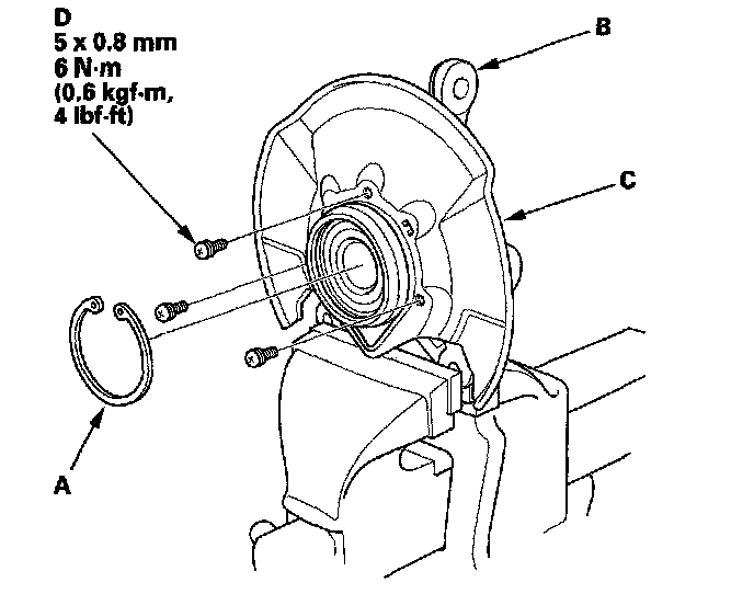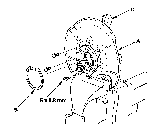 3. Remove the splash guard (A) and the snap ring (B) from the knuckle (C).
