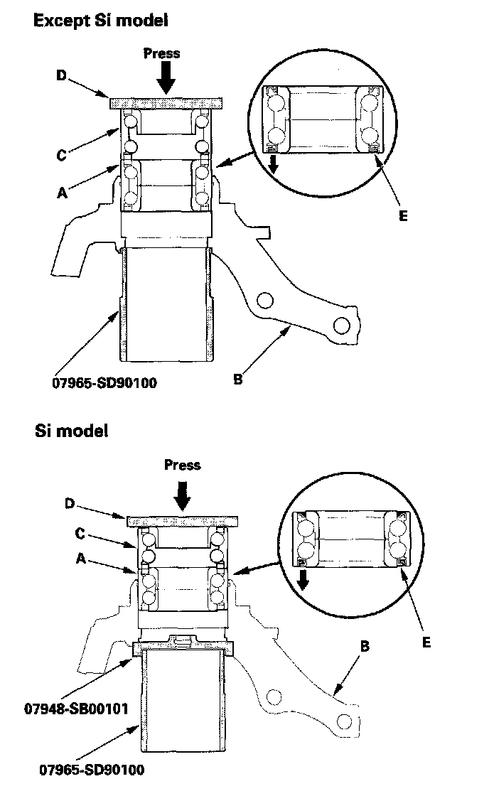 4. Press the wheel bearing (A) out of the knuckle (B) using the attachment, the driver, and a press.