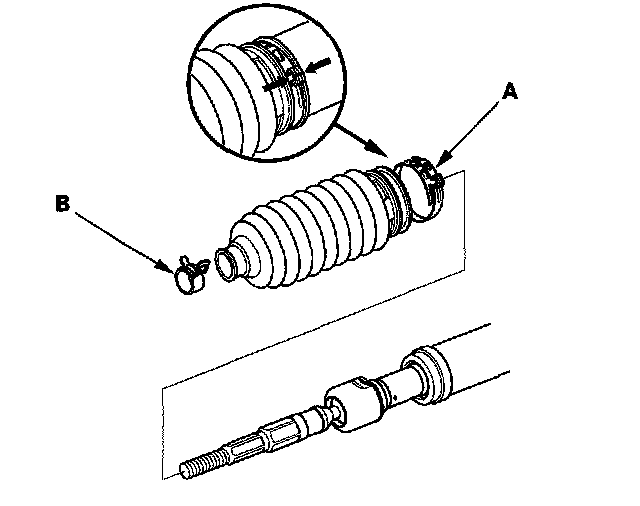 1. Remove the boot bands (A) and discard them. Remove the tie-rod clips (B), and pull the boots away from the ends of the steering gearbox.