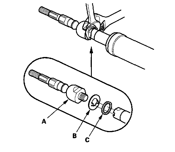 3. Unscrew both rack ends (A) with a wrench. Be careful not to damage the rack shaft surface with the wrench. Remove the lock washer (B) and rubber stop (C) and discard them.