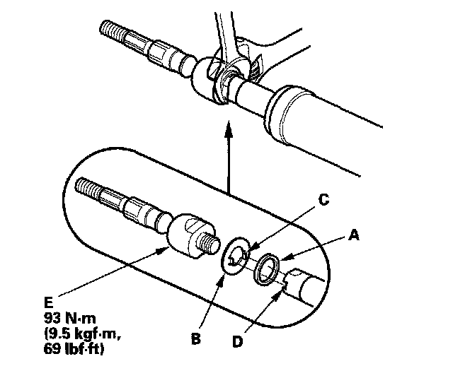 1. Install the new rubber stop (A) and lock washer (B) on the rack shaft. Align the lock washer tabs (C) with the slots (D) in the rack shaft. Install the rack end (E) while holding the lock washer in place. Repeat this step for the other side of the rack shaft.