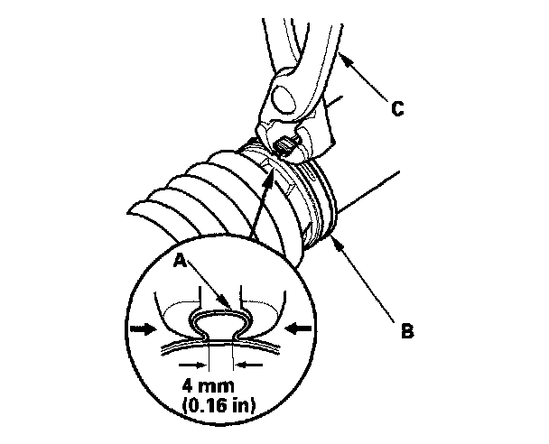 10. Close the ear portion (A) of the band (B) with commercially available pincers, Oetiker 1098 or equivalent (C).