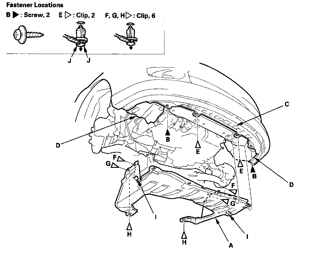 2. From the wheel arch on both sides, remove the clips (F) that secure the front splash shield and front inner fender to the body, and remove the clips (G) that secure the front splash shield to the body.
