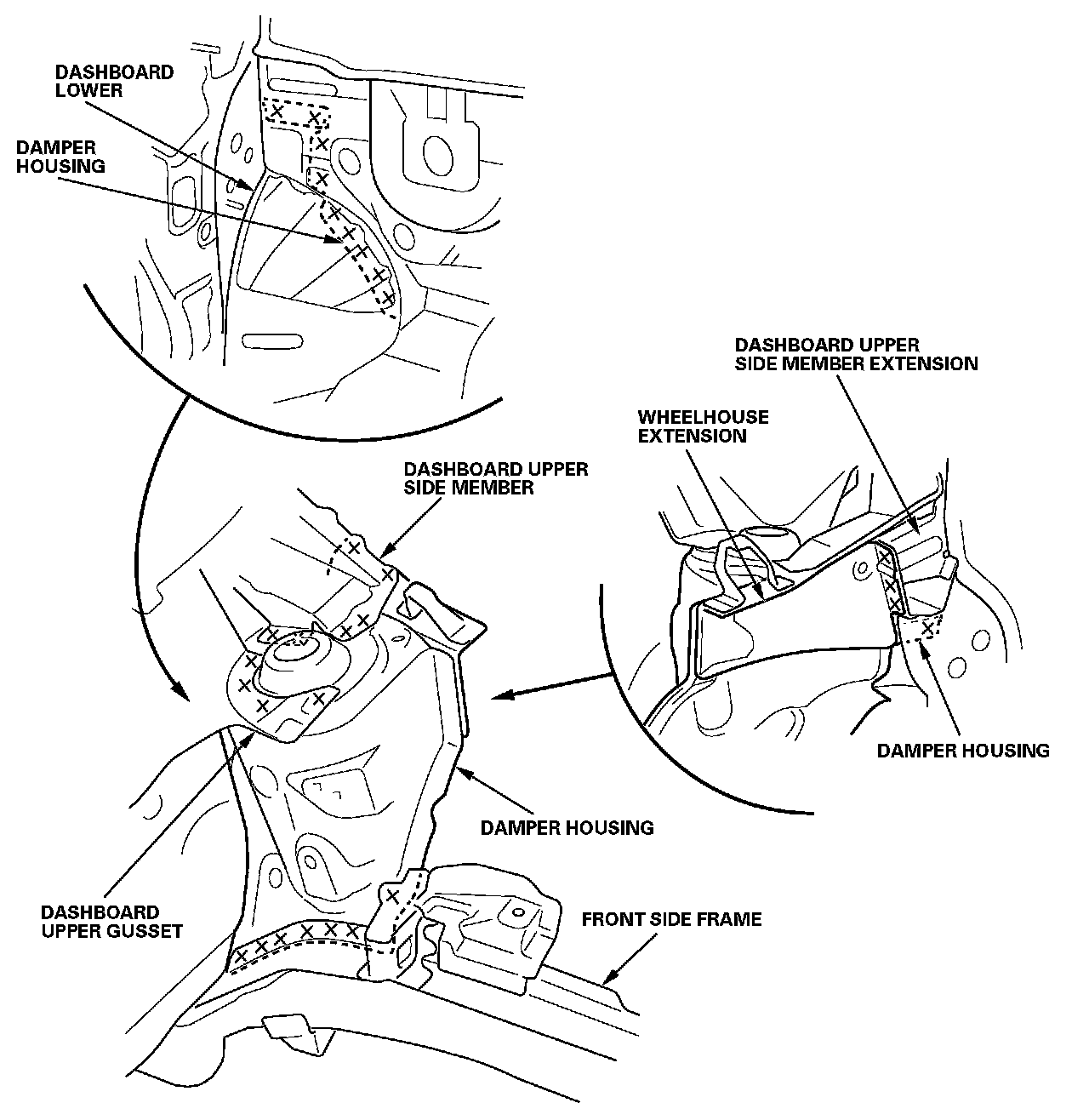- If necessary, replace the damper housing and wheelhouse extention as an assembly.