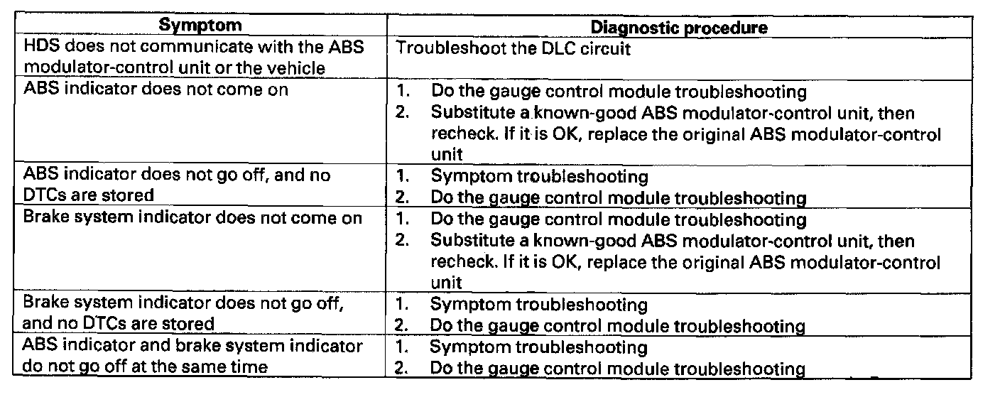 Symptom Troubleshooting IndexWhen the vehicle has one of these symptoms, check for a diagnostic trouble code (DTC) with the HDS. If there is no DTC, do the diagnostic procedure for the symptom, in the sequence listed, until you find the cause.