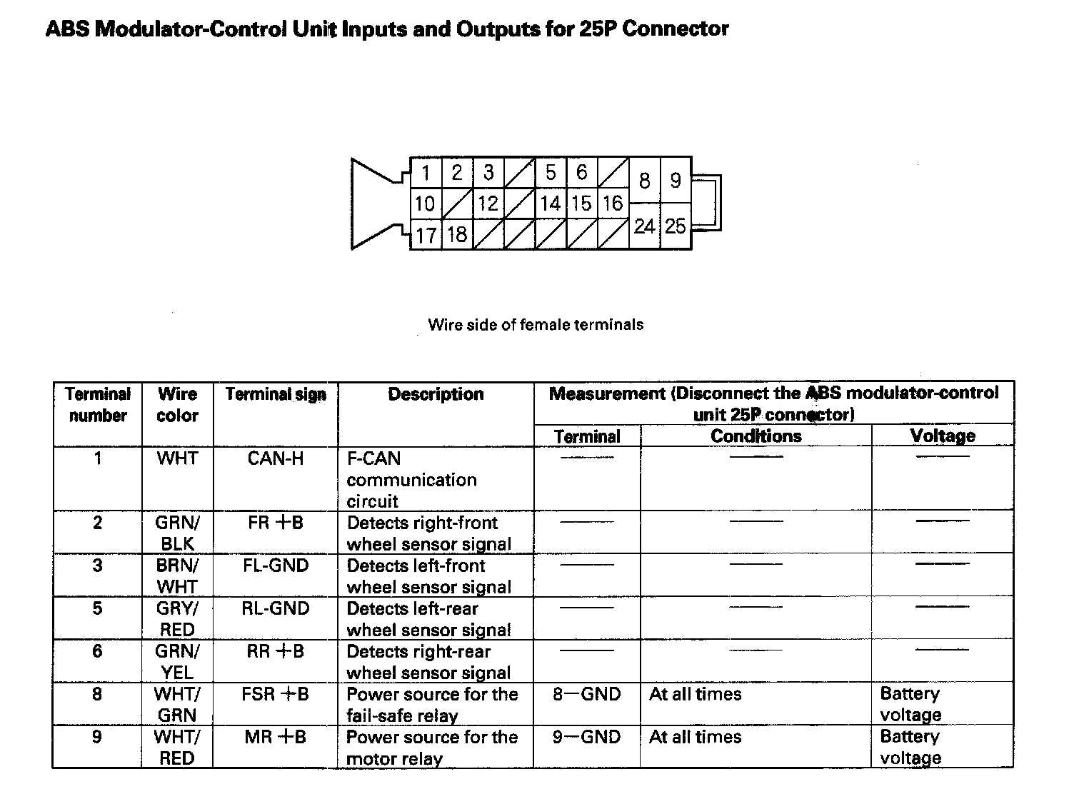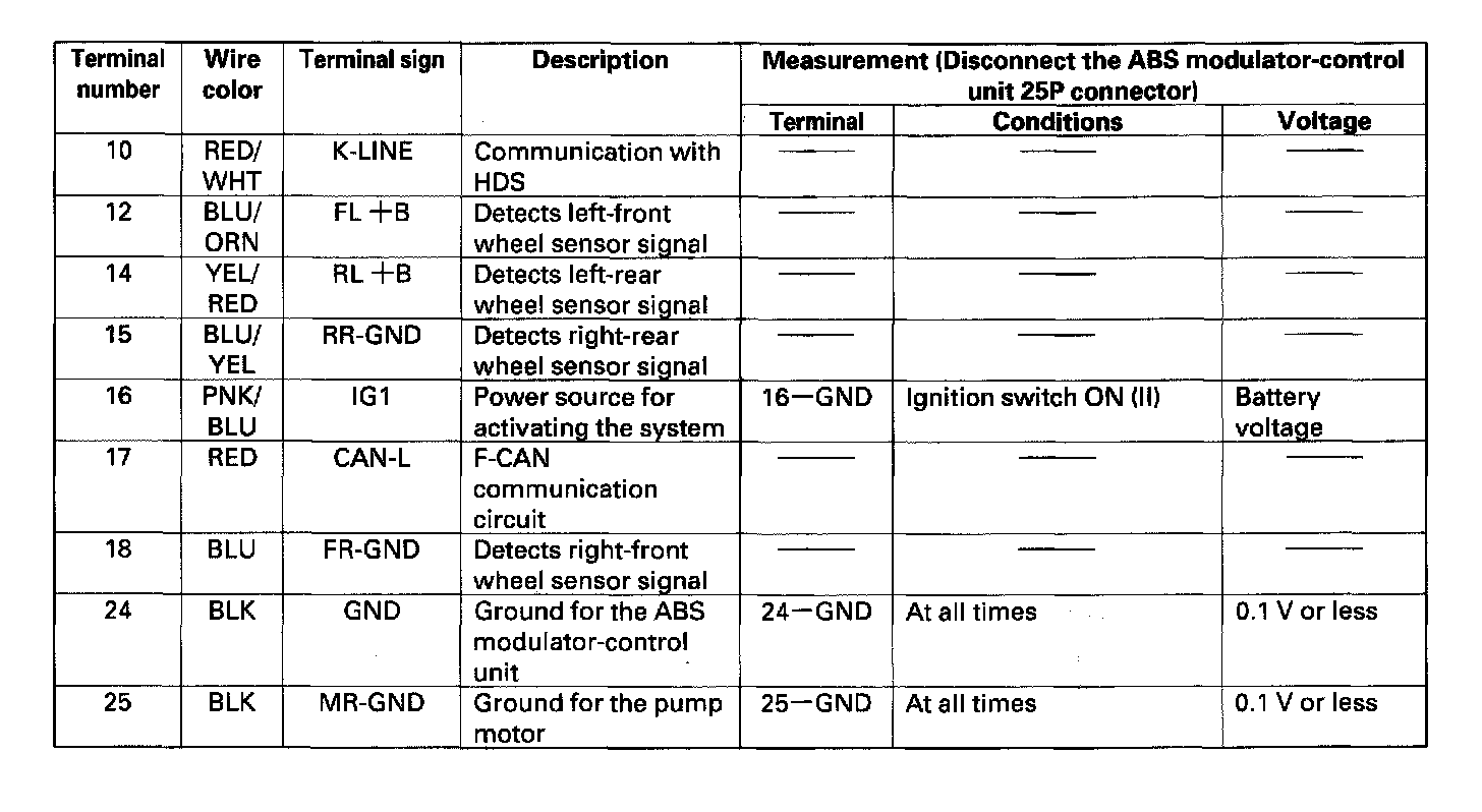ABS Modulator-Control Unit Inputs and Outputs for 25P Connector (Part 1):