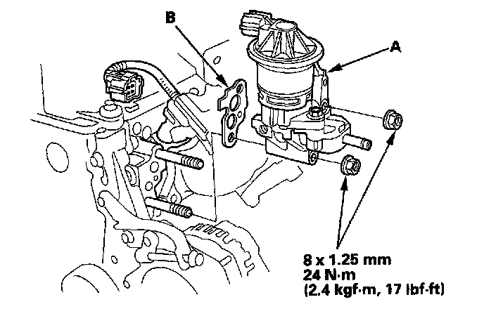 3. Be sure the mounting surface is completely clean, then install the EGR passage, using the new gasket (B).