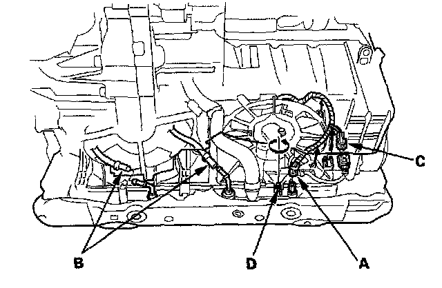 17. With A/C: Disconnect the A/C compressor clutch connector (C), then loosen the A/C condenser fan shroud mounting bolt (D).
