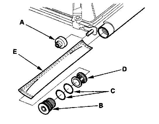 2. Remove the mount (A) and the cap (B) from the bottom of the A/C condenser, then remove the O-rings (C), the filter (D). and the desiccant (E).
