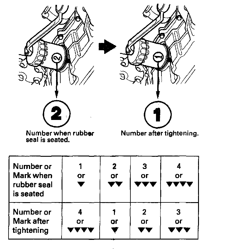 ^ Spin the filter on until its seal lightly seats against the oil pan, and note which number or mark is at the bottom.