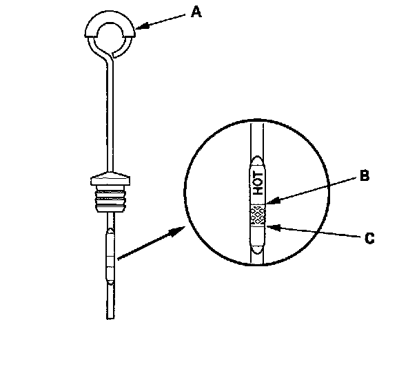 5. Remove the dipstick (A), and check the fluid level. It should be between upper mark (B) and lower mark (C).