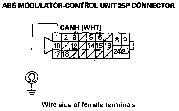 14. Check for continuity between ABS modulator-control unit 25P connector terminal No. 17 and body ground.