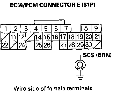 7. Check for continuity between ECM/PCM connector terminal E29 and body ground.