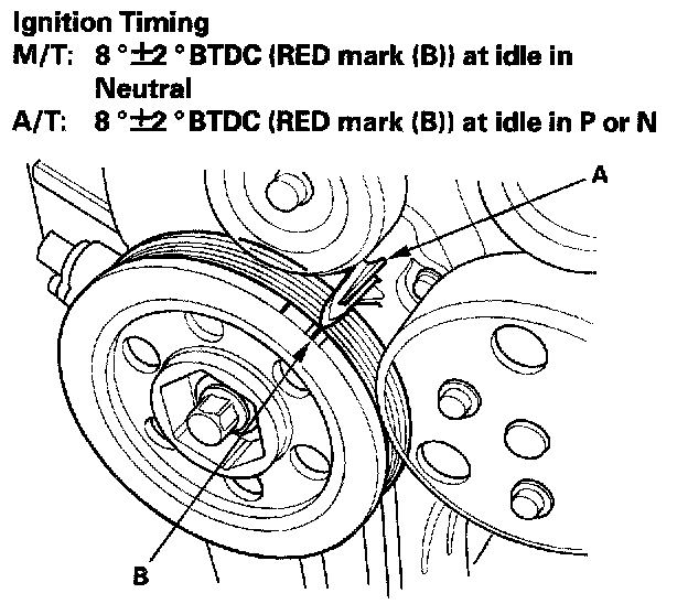 8. Aim the light toward the pointer (A) on the cam chain case. Check the ignition timing under a no load condition (headlights, blower fan, rear window defogger, and air conditioner are turned off).