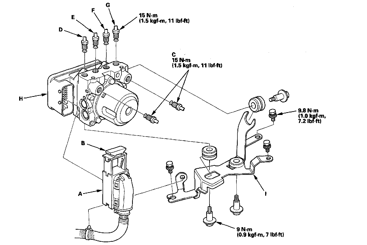 3. Remove the ABS modulator-control unit (H) with the brackets (I) from the body.