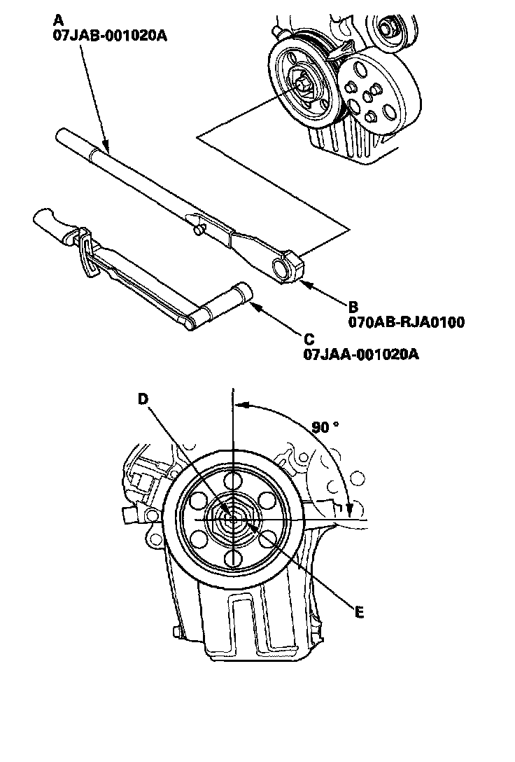 2. Mark the bolt head and the crankshaft pulley as shown, then tighten the bolt an additional 90°