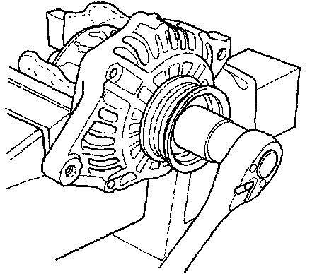 7. If you are not replacing the front bearing and/or rear bearing, go to step 15. Clamp the rotor in a soft-jawed vise, then remove the pulley locknut.