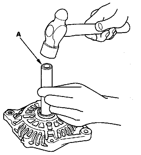 13. Support the drive-end housing in a vise, and drive out the front bearing with a brass drift (A) and a hammer.