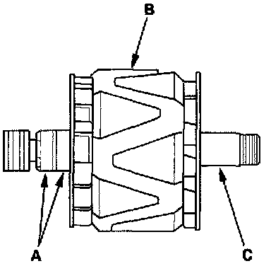 17. Check that there is no continuity between each slip ring (A) and the rotor (B) and the rotor shaft (C).