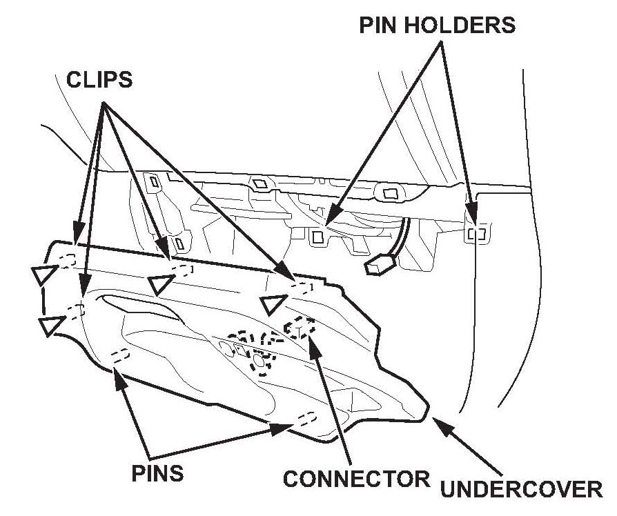 ^ Pull the undercover away to release it from the clip on the body and to release its pin from the kick panel.