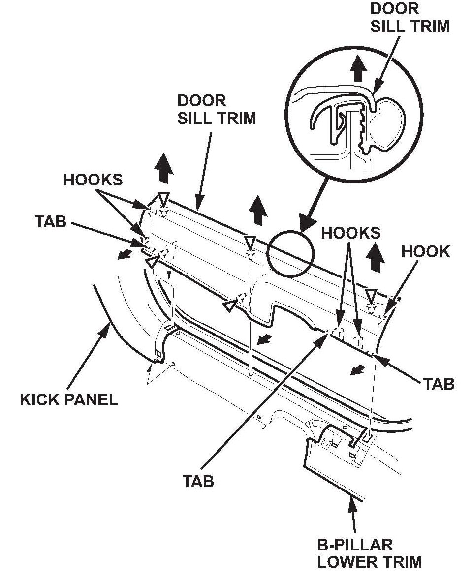 3. Remove the passenger's front door sill trim by detaching the hooks and tabs from the front passenger's side kick panel and the B-pillar lower trim. Then remove the door sill trim by pulling it up to detach its clips.