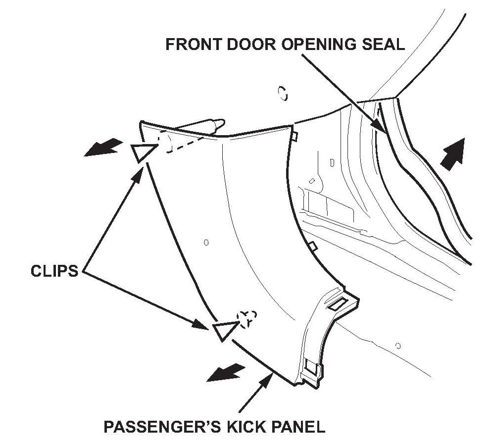 4. Pull the door opening seal away as needed, pull the passenger's kick panel back by hand to detach its clips, then remove the kick panel.