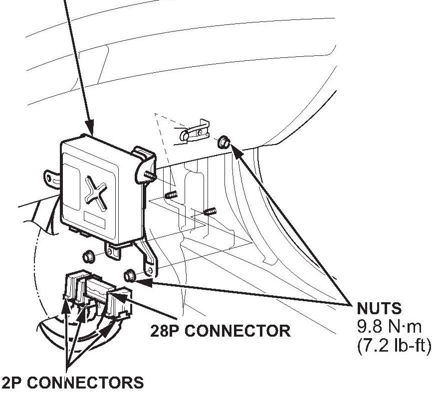 6. Install the new EPS control unit, torque the three mounting nuts to 9.8 N.m (7.2 lb-ft), and reconnect the connectors.