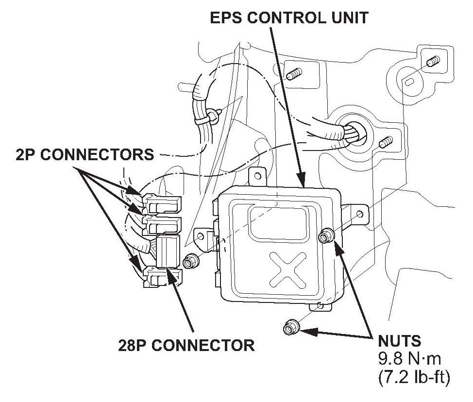 7. Install the new EPS control unit, torque the three mounting nuts to 9.8 N.m (7.2 lb-ft), and reconnect the connectors.